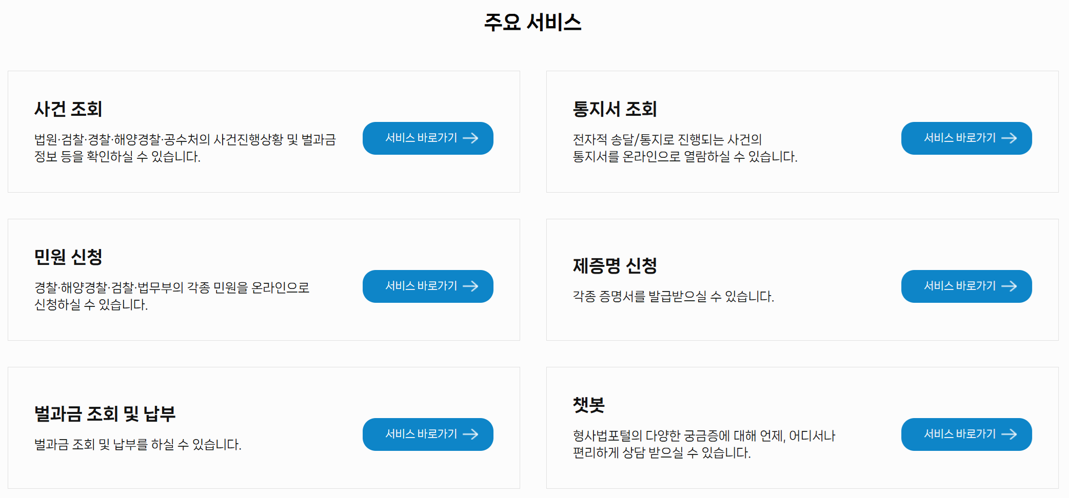 사건진행 정보, 온라인 민원처리 및 안내 벌과금 납부 조회 등 형사사법기관의 각종 형사사법정보를 온라은을 통해 빠르고 편리하게 제공하는 대국민 서비스 포털입니다.