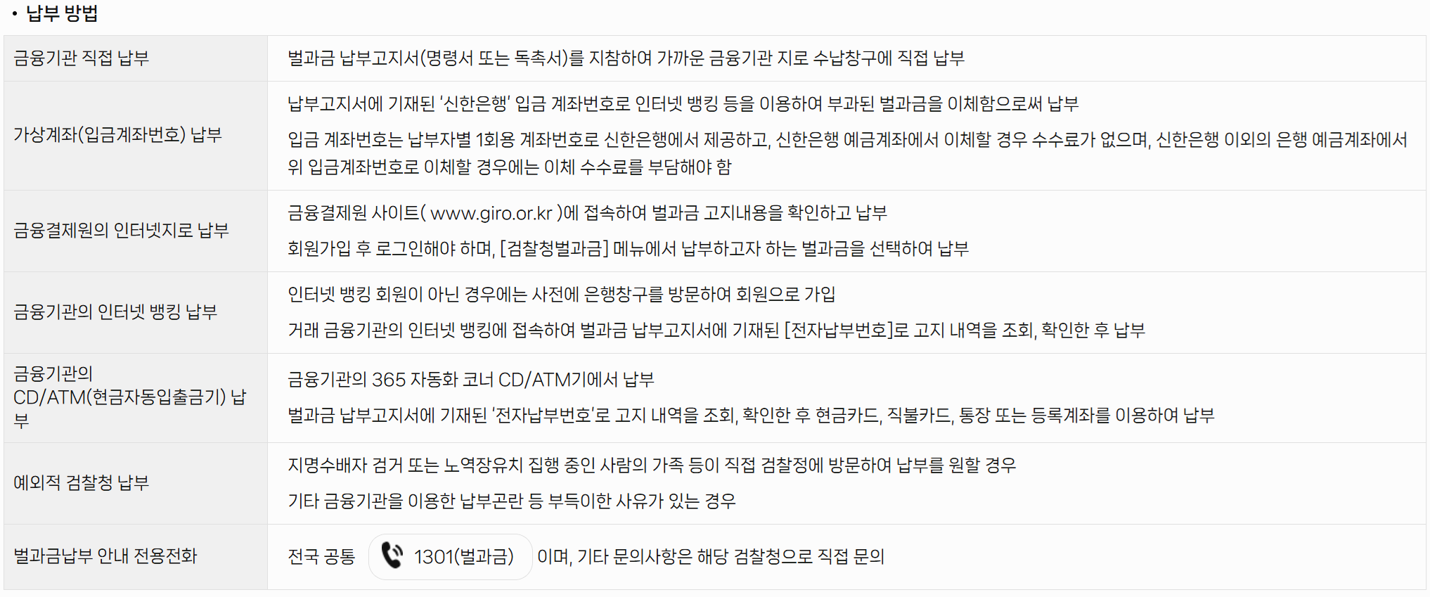 벌과금 납부는 금융기관을 통해 납부하여야 하며, 가상계좌납부, 금융기관 직접 납부 등 납부 방법 중 편리한 방법은 선택하여 납부하실수있습니다.